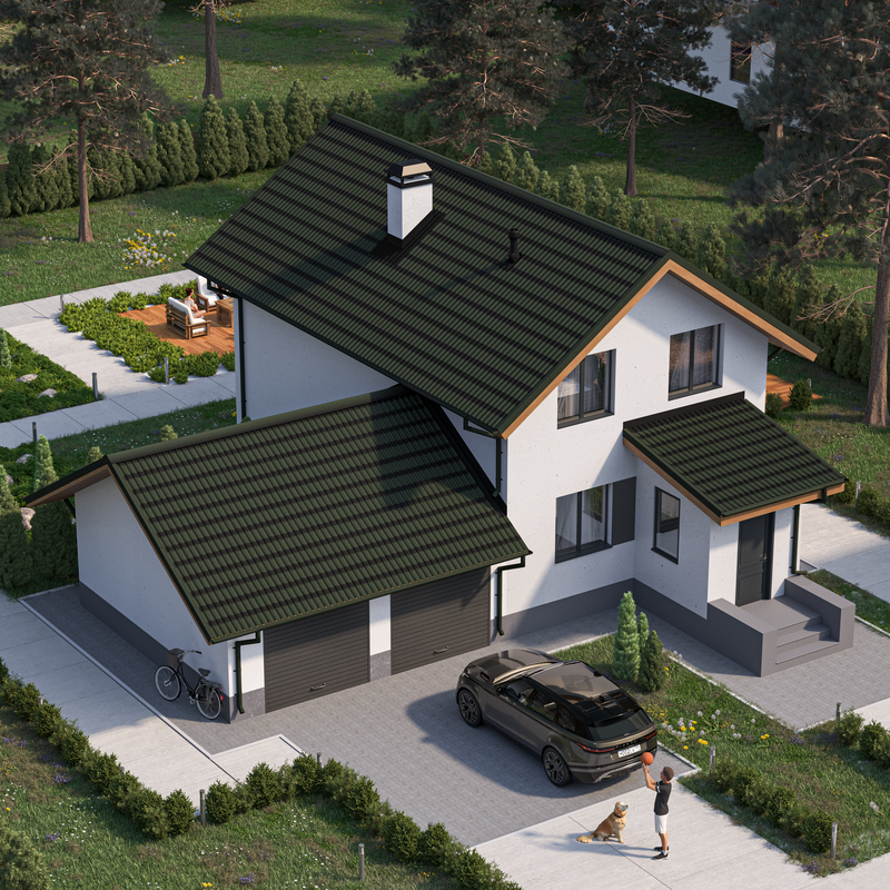 ONDULINE TILE зеленый дом двускатный рендер ракурс2 2024 3000х3000